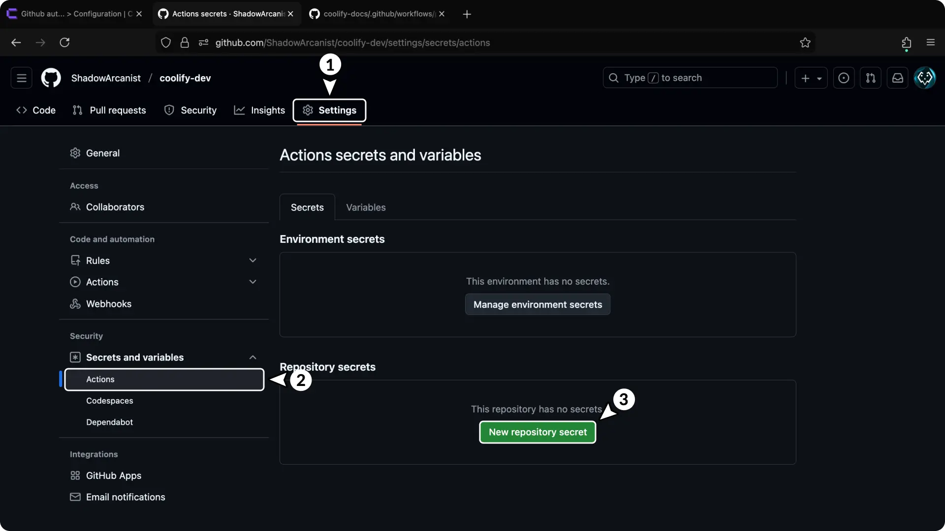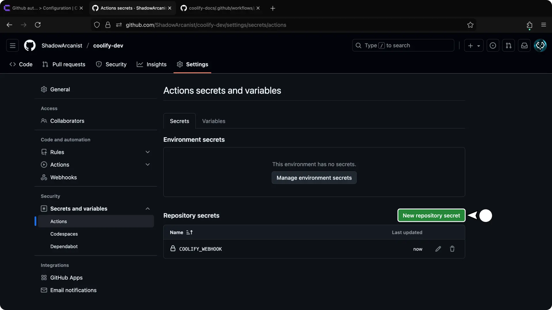 COOLIFY_TOKENas the name. - Enter the Coolify API token as the secret (from step 3).