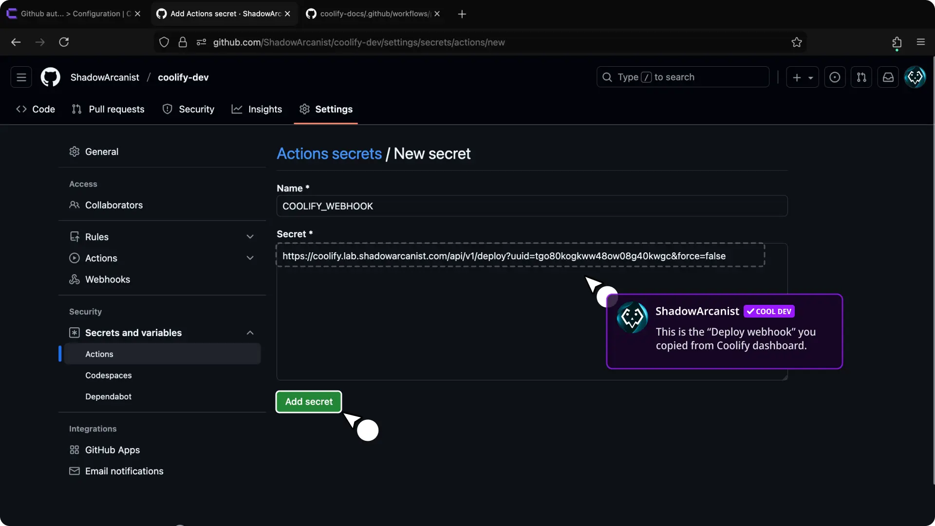 COOLIFY_WEBHOOKas the name. - Enter the Coolify deploy webhook URL as the secret (from step 4).