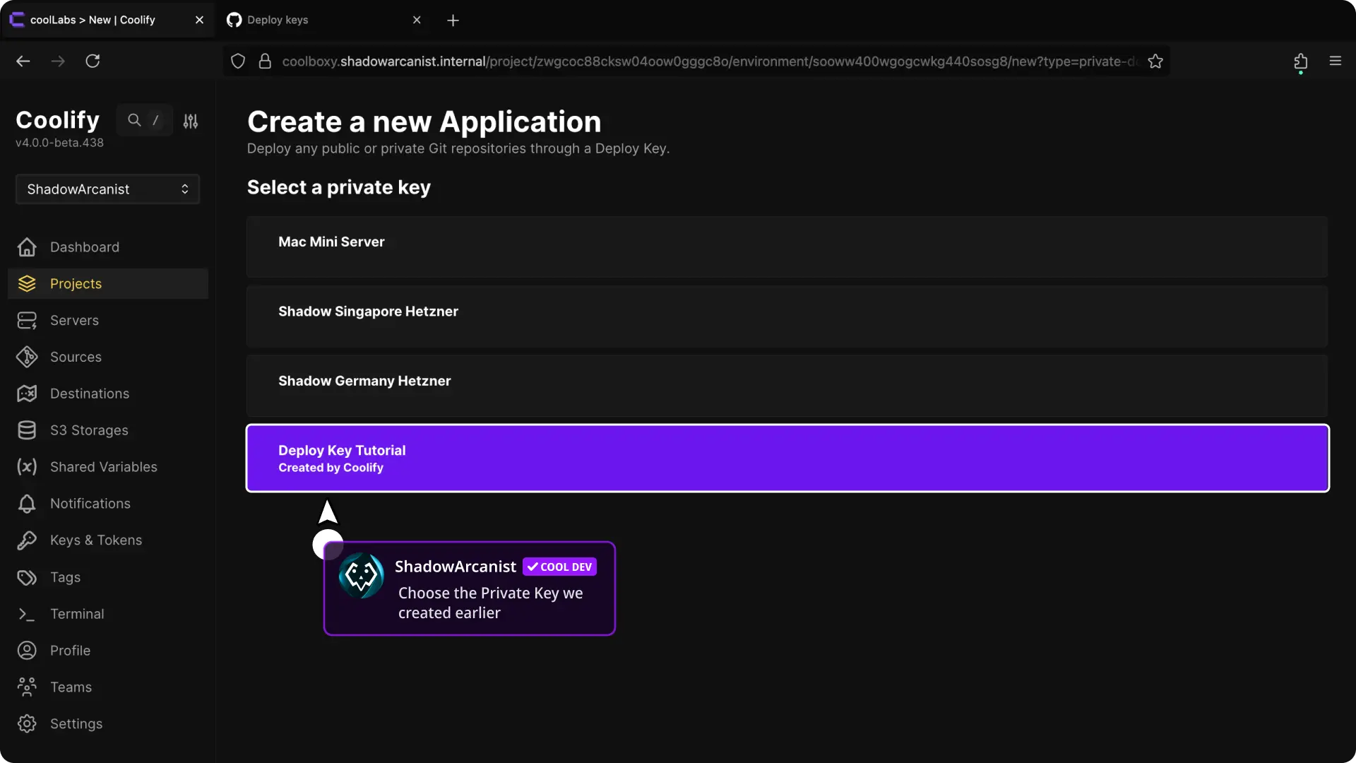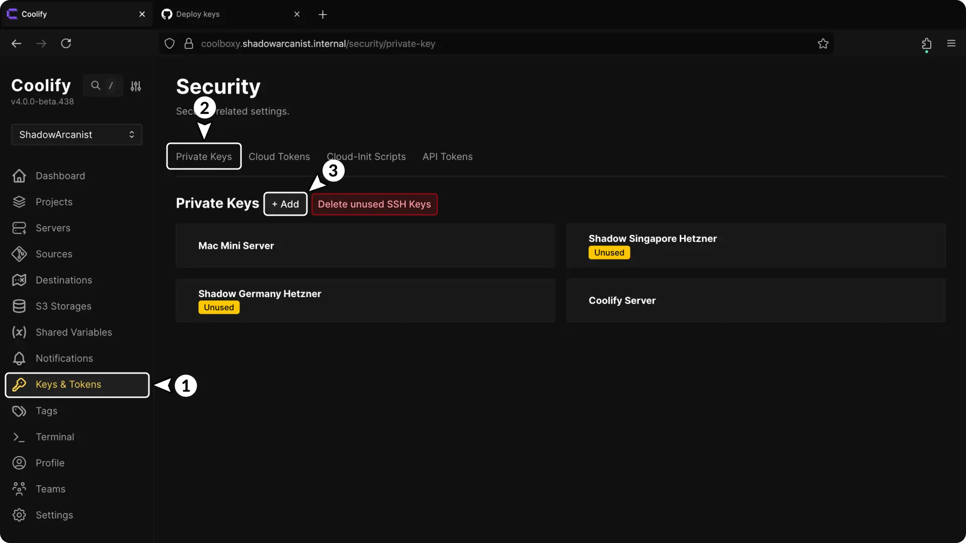 - In your Coolify dashboard, click on Keys & Tokens from the sidebar.