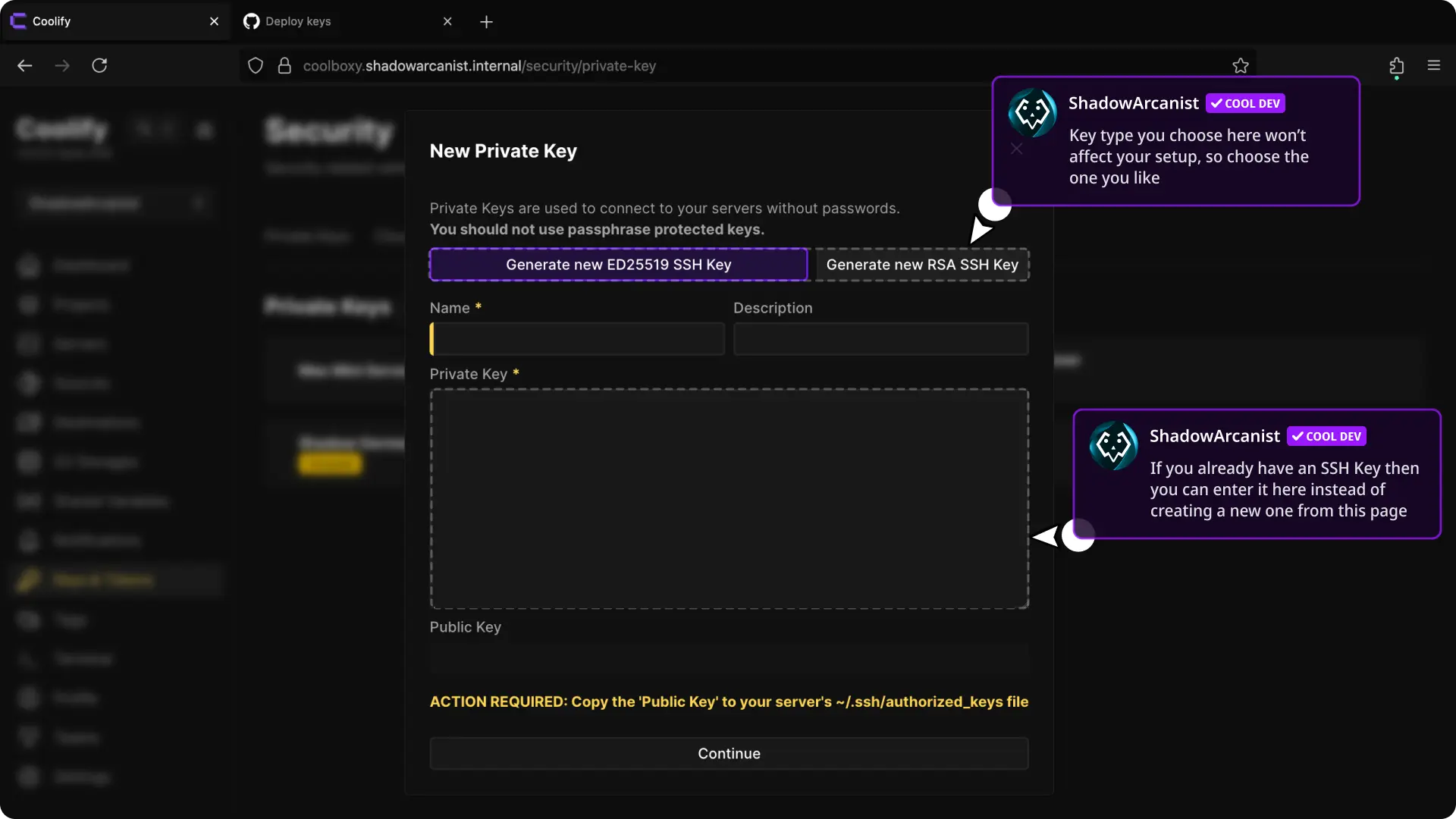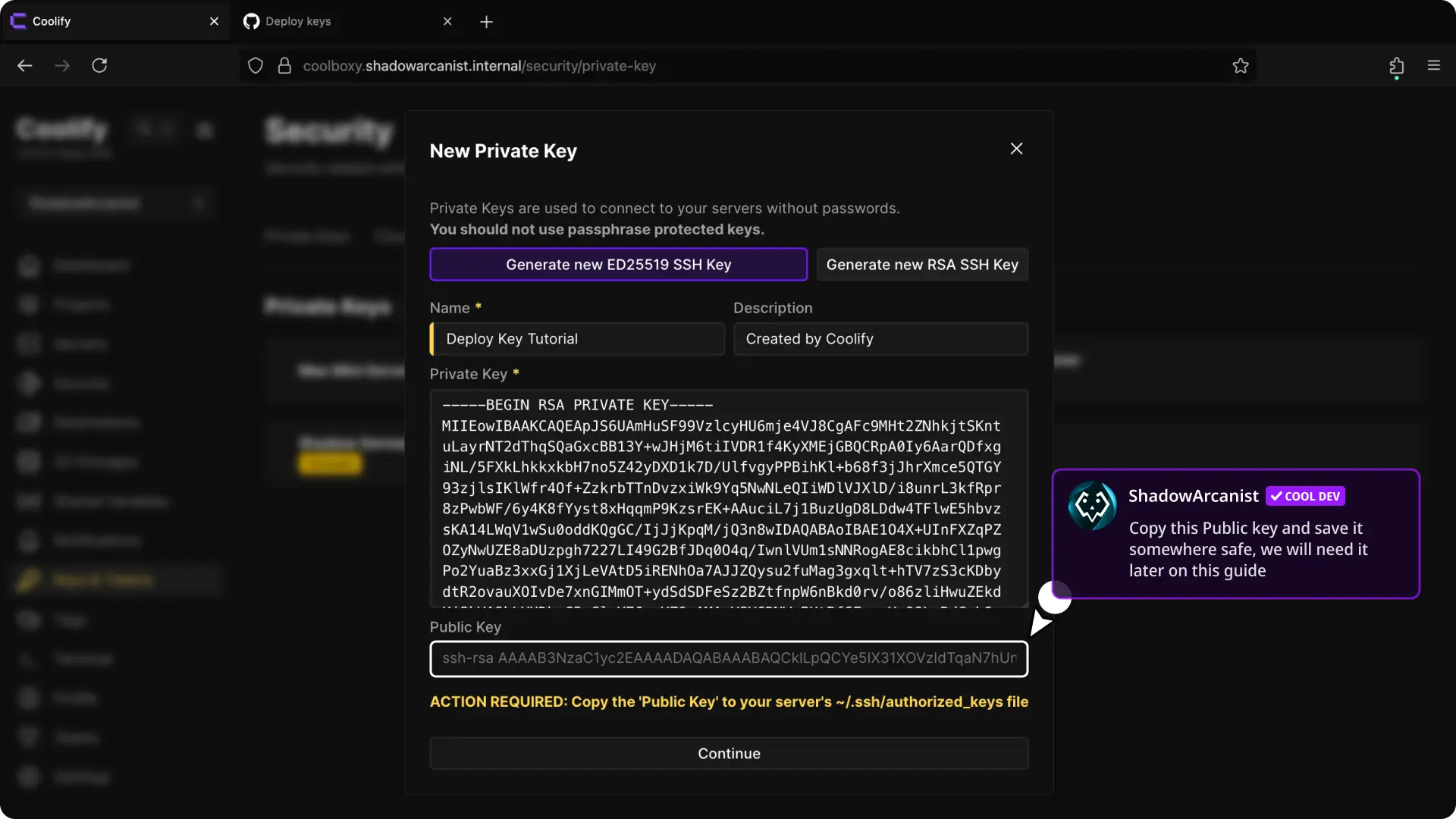 ssh-keygen -t rsa -b 4096 -C "coolify-deploy-key"Then, copy the contents of the generated .pub file for the next step.
