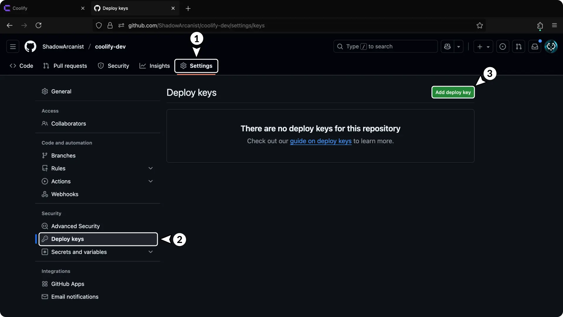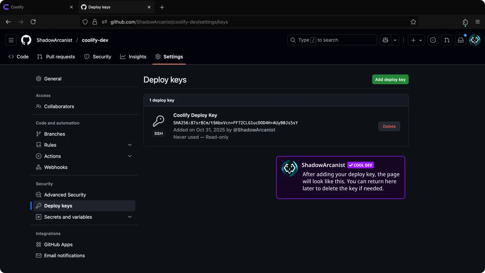 When using deploy keys, Coolify can clone and deploy from private repositories securely, ensuring that only the specified repository is accessible.