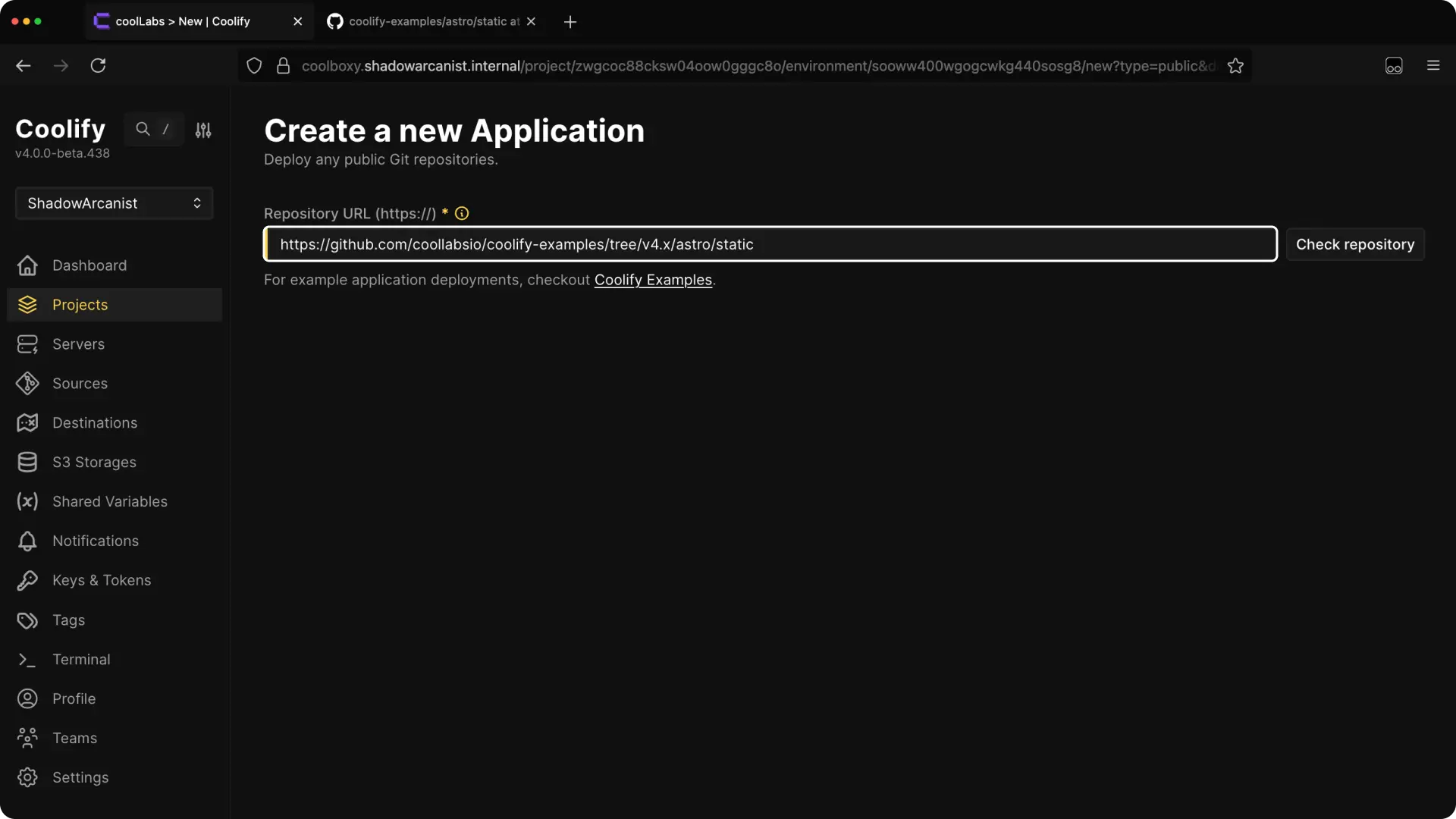 - https://github.com/coollabsio/coolify-examples → main branch will be selected.