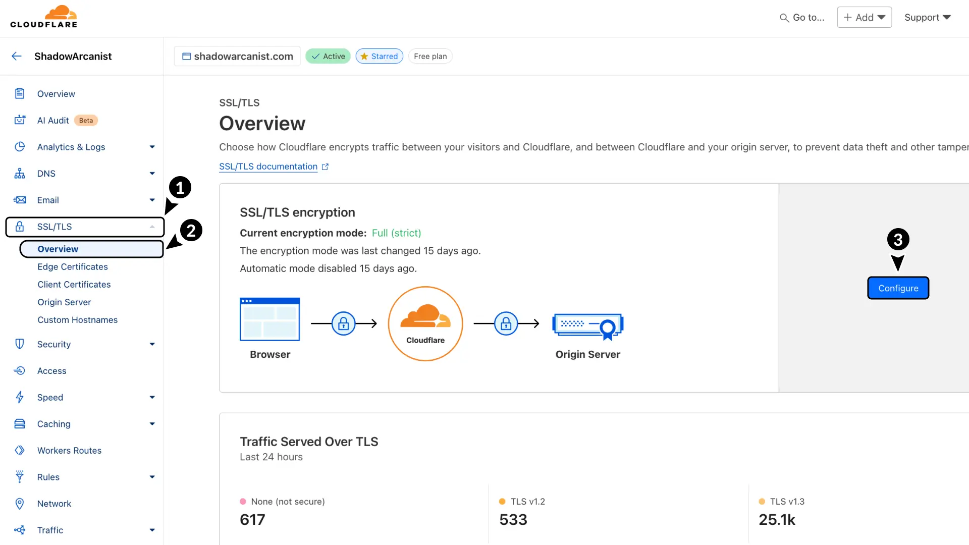 - In your Cloudflare dashboard, go to SSL/TLS.