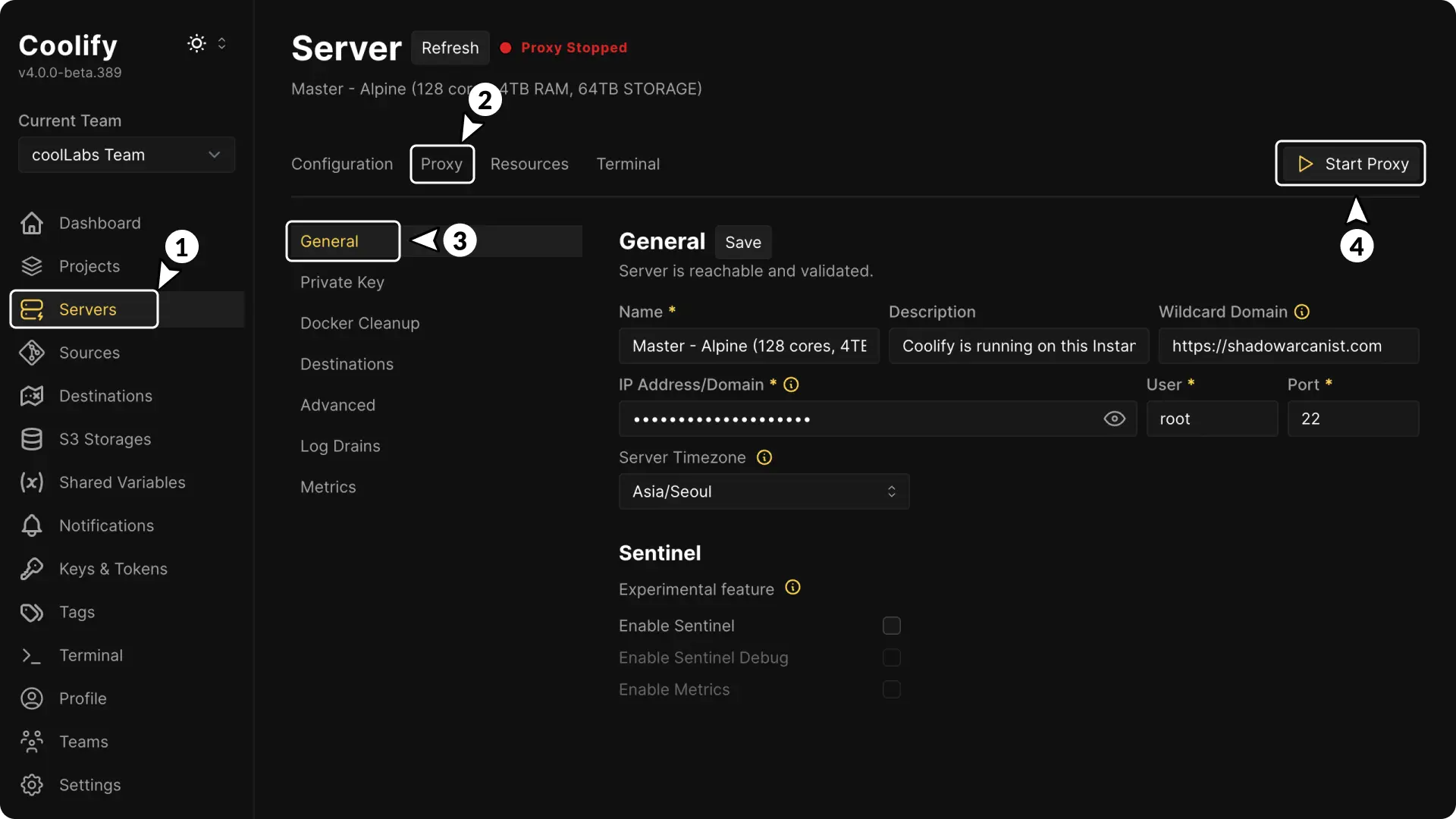 - Select the server where coolify is running, then Click on the Proxy tab.