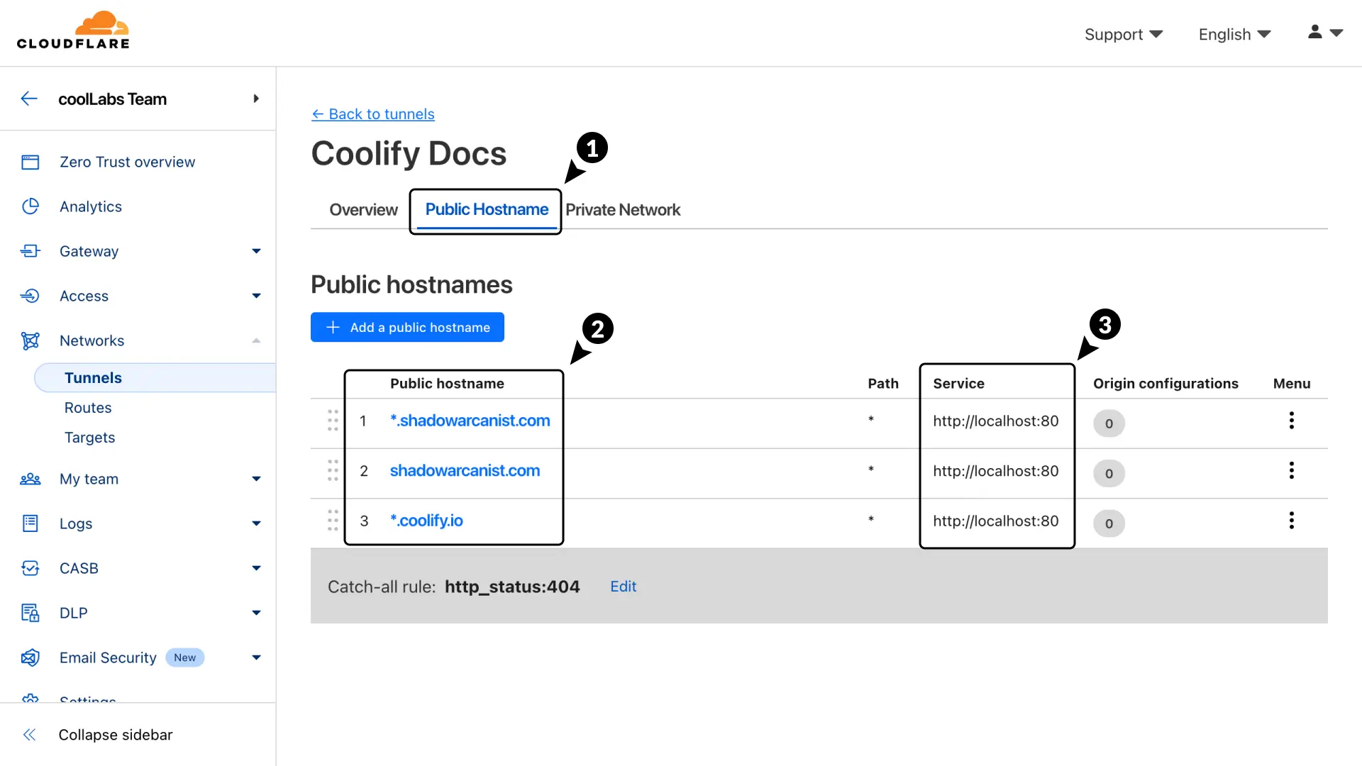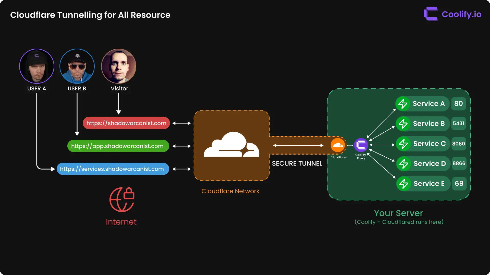 The Coolify proxy is used to route traffic to apps running on your server. This eliminates the need to create new hostnames on the Cloudflare tunnel every time you deploy a new app.