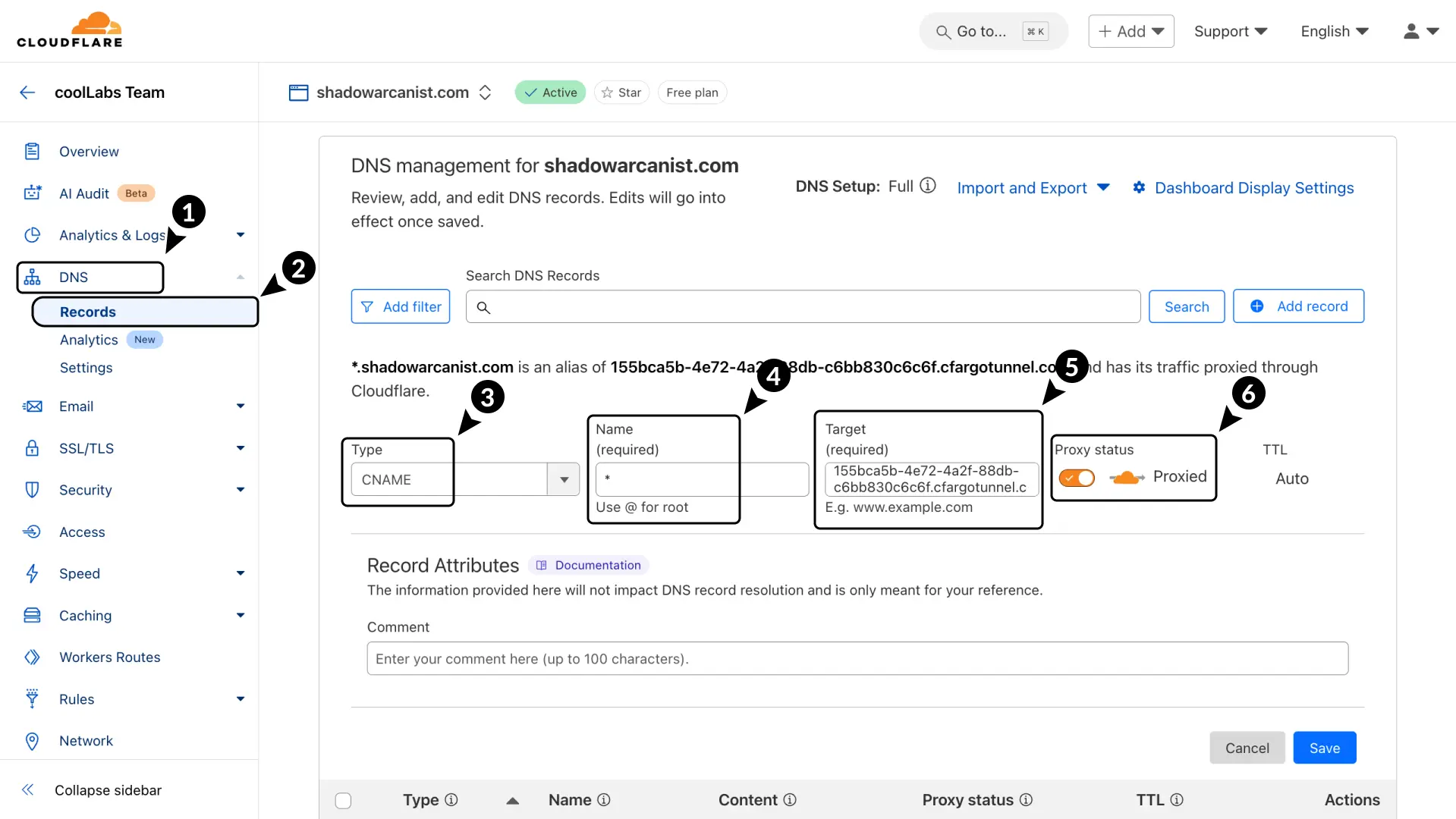 .cfargotunnel.com - Set the proxy status to Proxied.