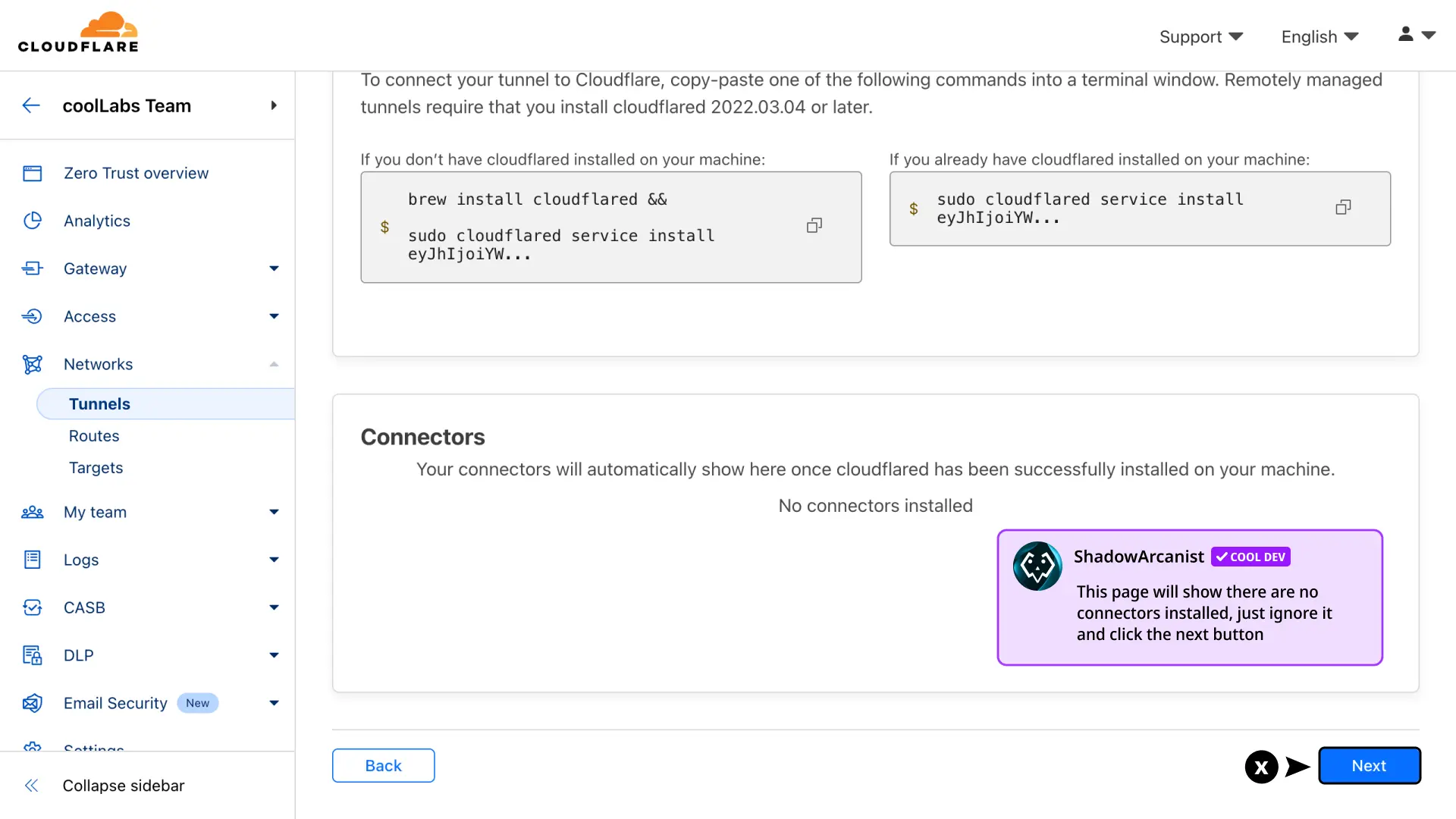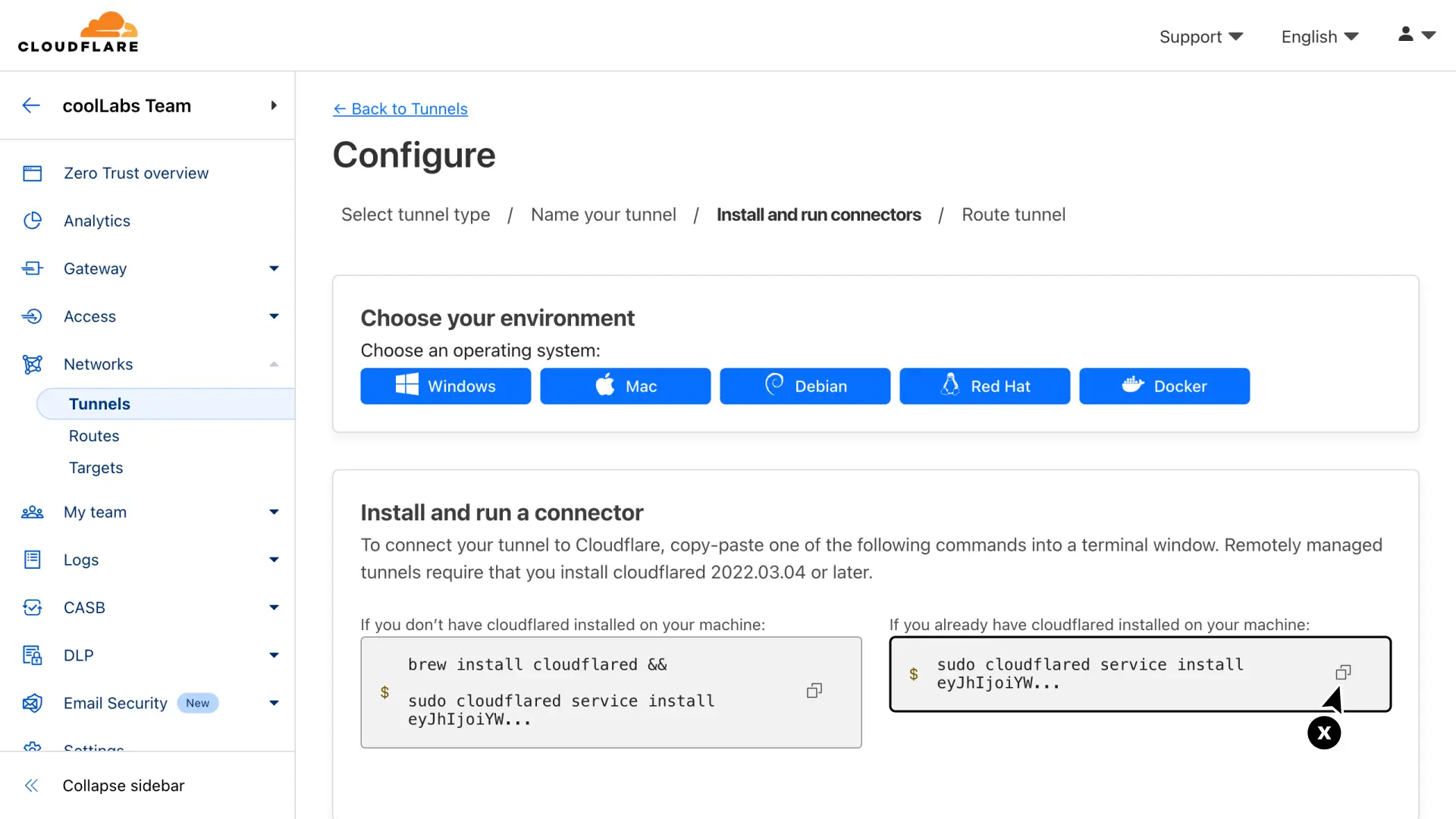 Copy the install command, which contains the token for your tunnel (token starts with "eyJ"). Make sure to save only the token, removing the command part before it, and store it in a safe place, as we need it later.