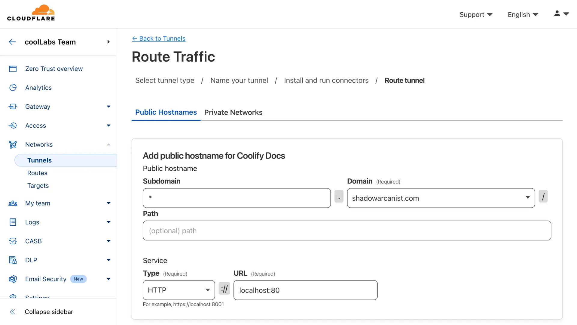 *or the name of your subdomain (this should match the hostname you have for your app on the tunnel). - For the Target, enter the tunnel ID followed by