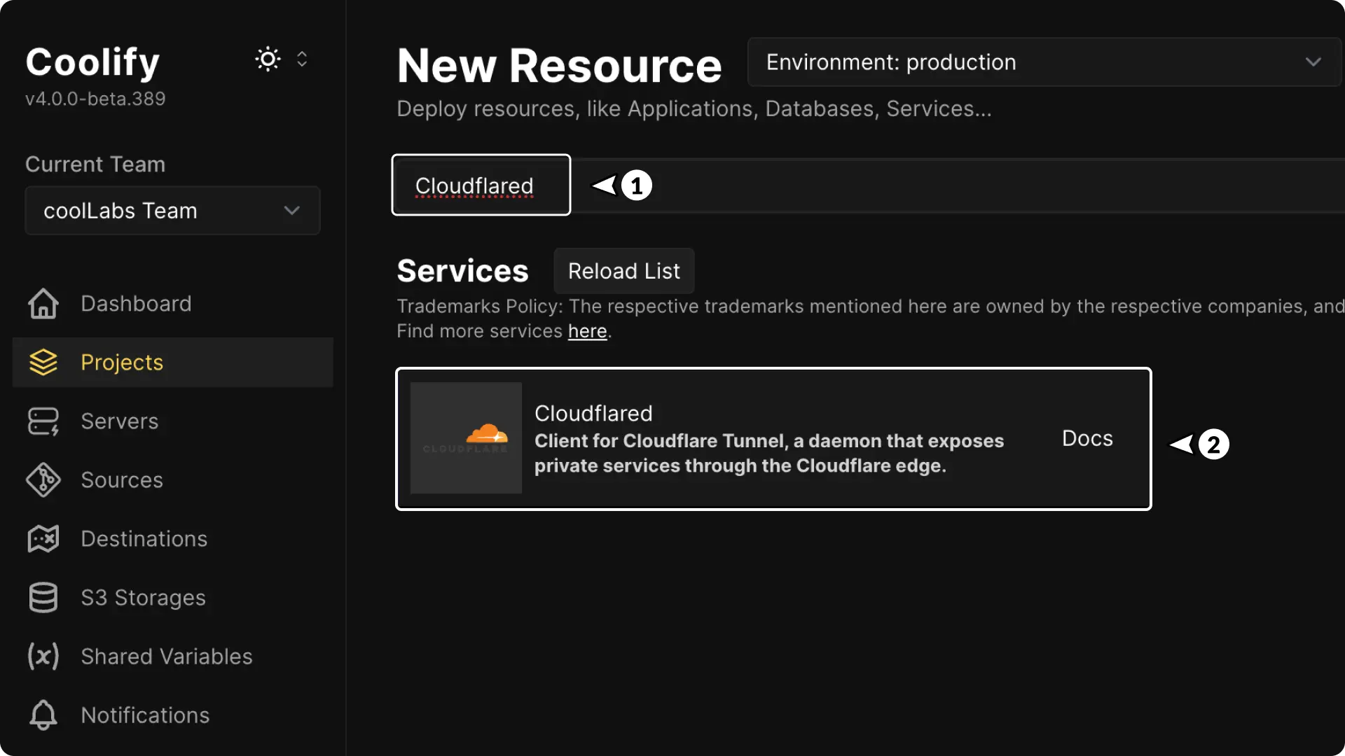 You will see many options to deploy a new app. Search for Cloudflared and click on it.