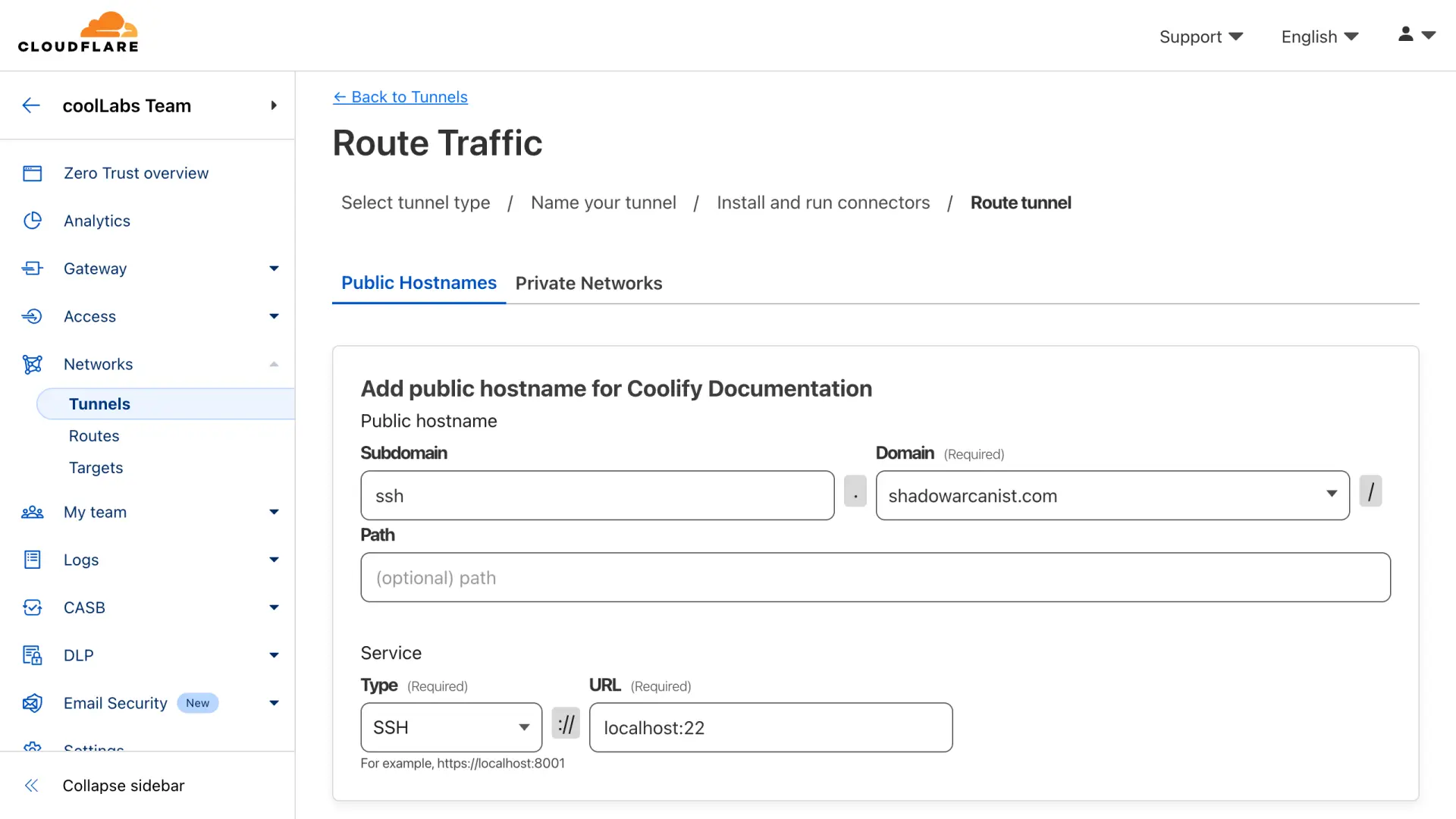 Then, you will be prompted to add a hostname. This is where we expose our SSH tunnel.