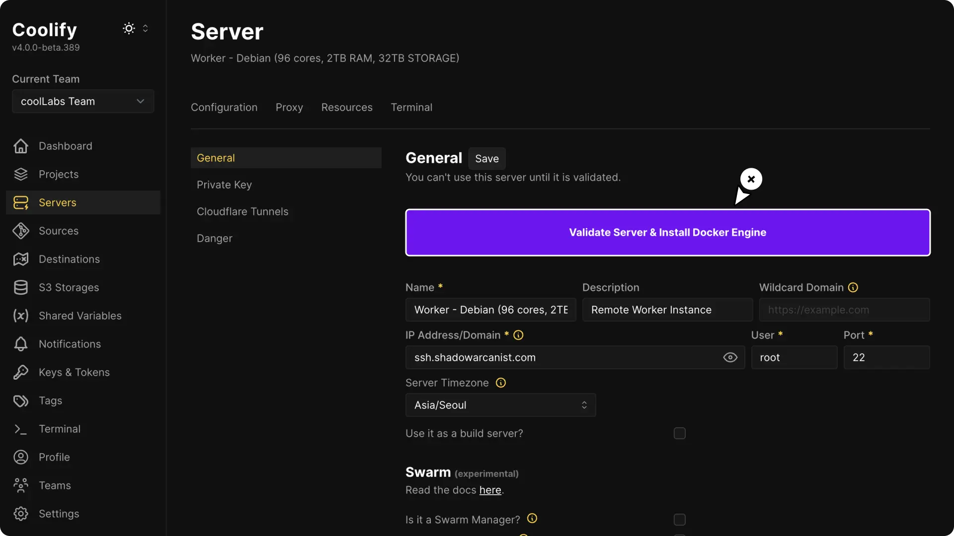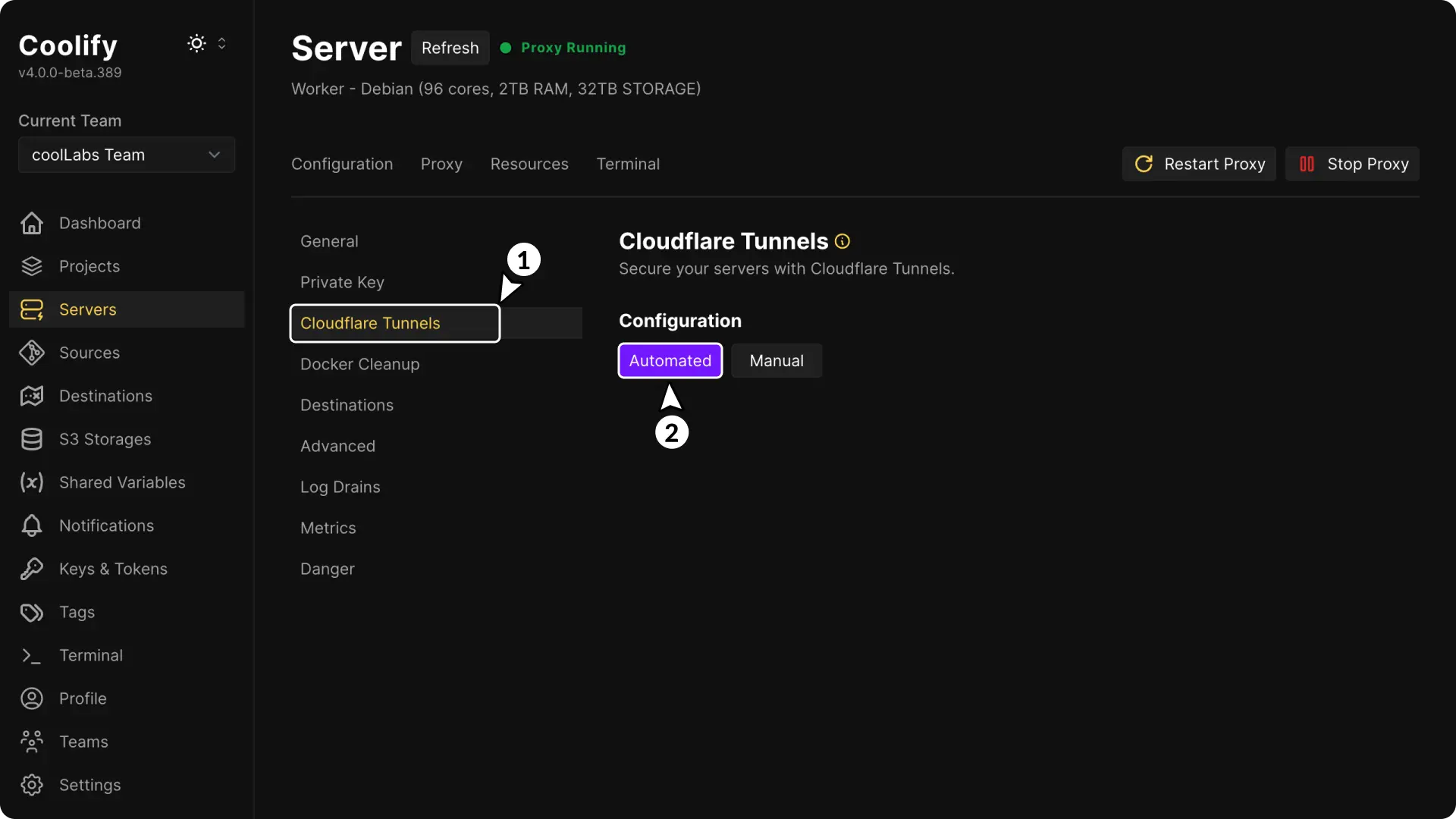 - We assume you already have a server running Coolify and you are looking to set up a tunnel to connect a different server to Coolify.