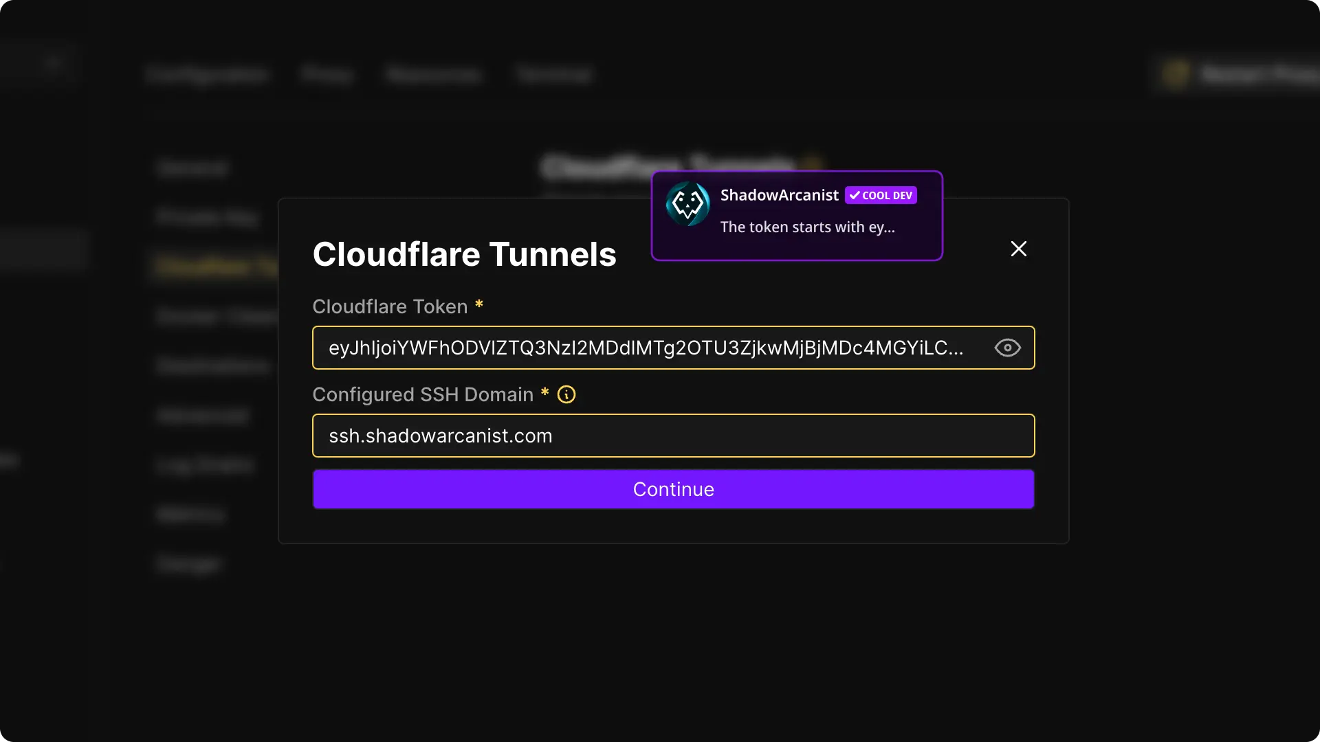You will be prompted to enter the Tunnel Token and SSH domain.