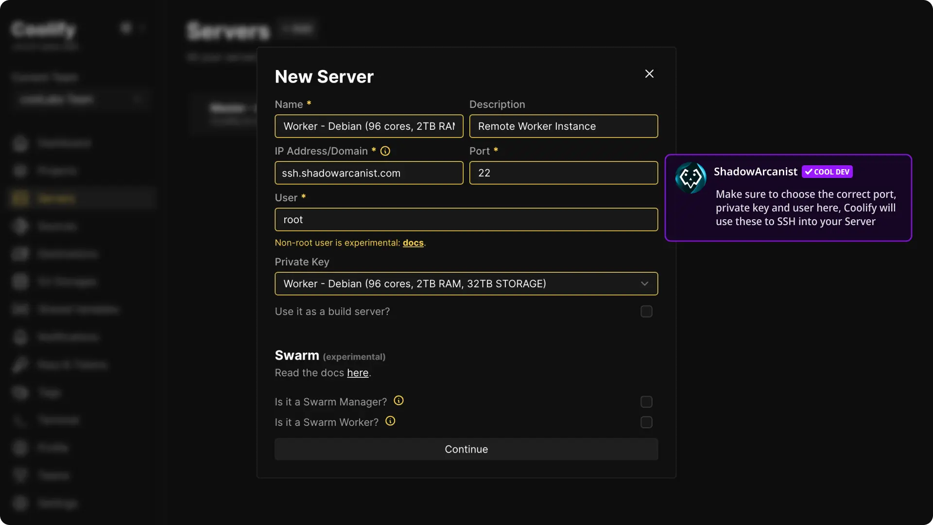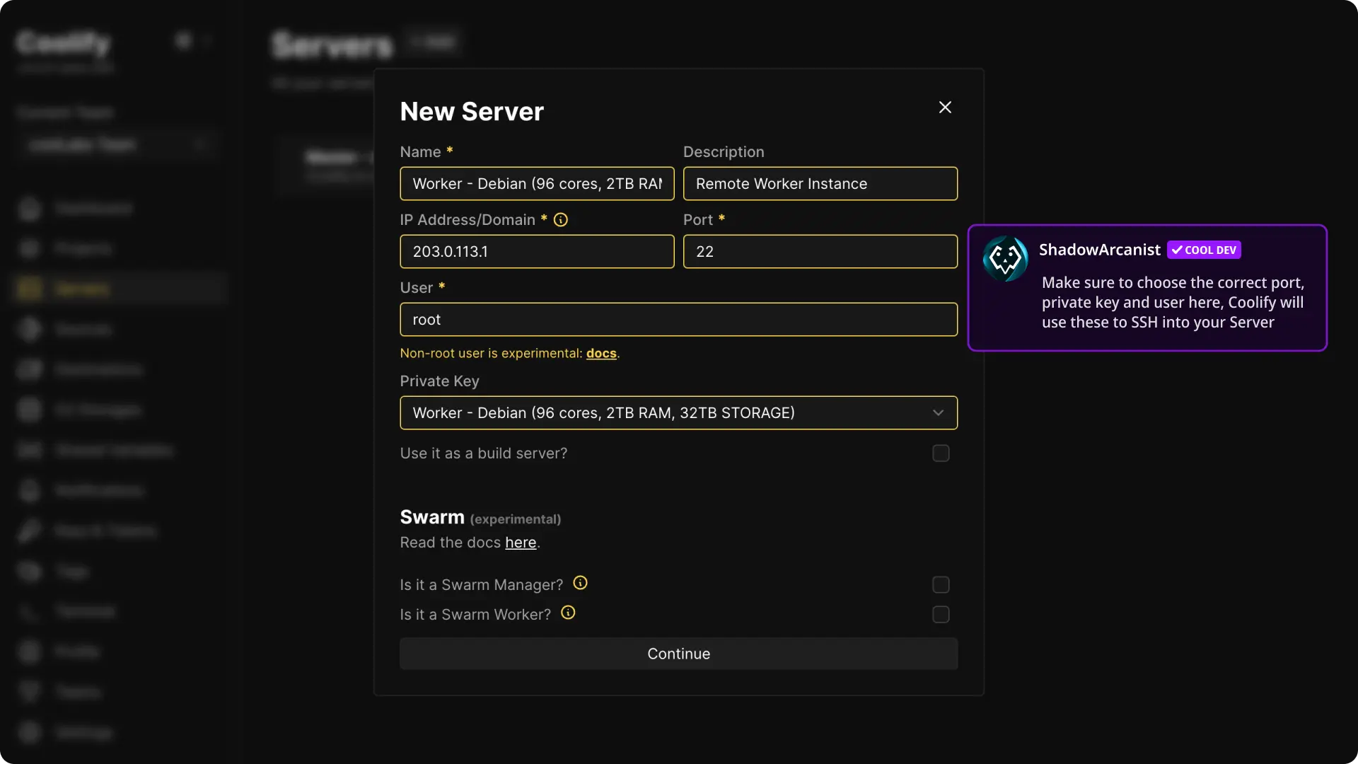 You will be prompted to enter details about your server. Make sure the information you provide is accurate, as Coolify will use these details to access your server.