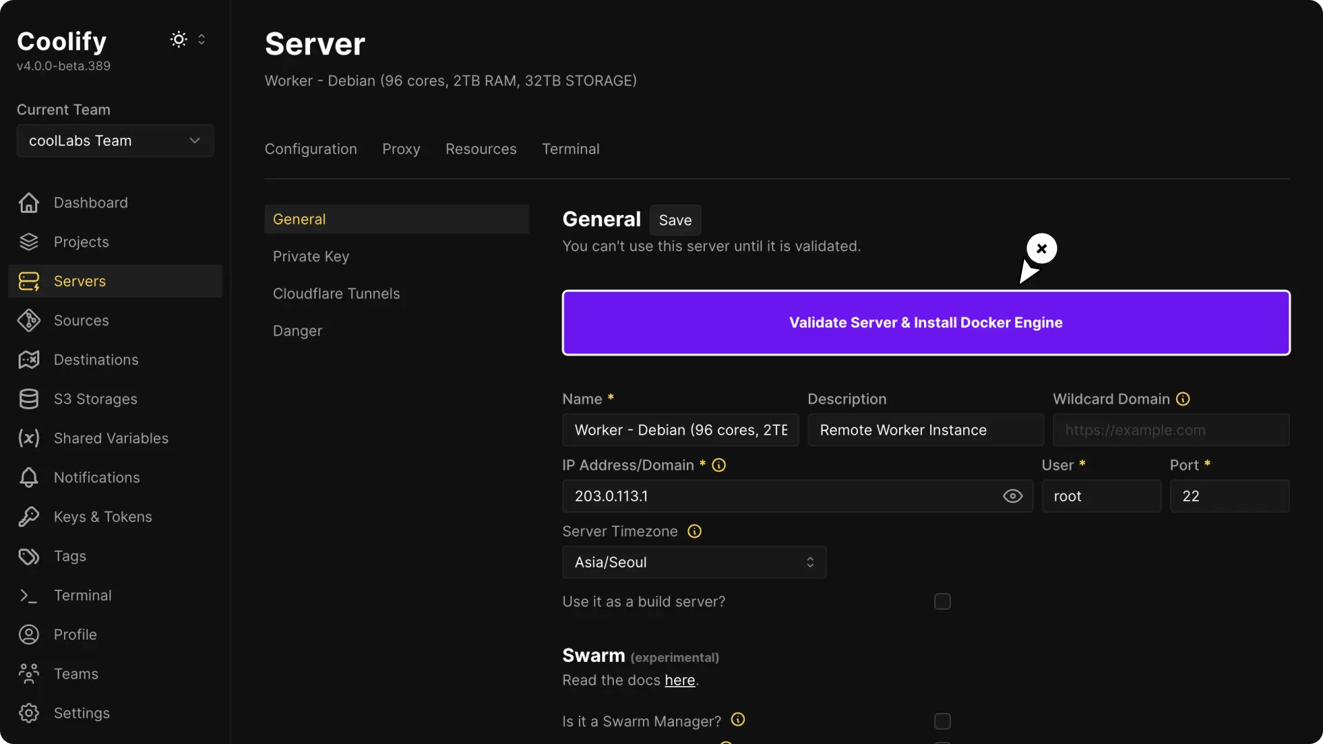 - Your remote server must have a public IP address and an active SSH port during the initial setup for Coolify to configure the tunnel. After setup, you can close all ports on the server.