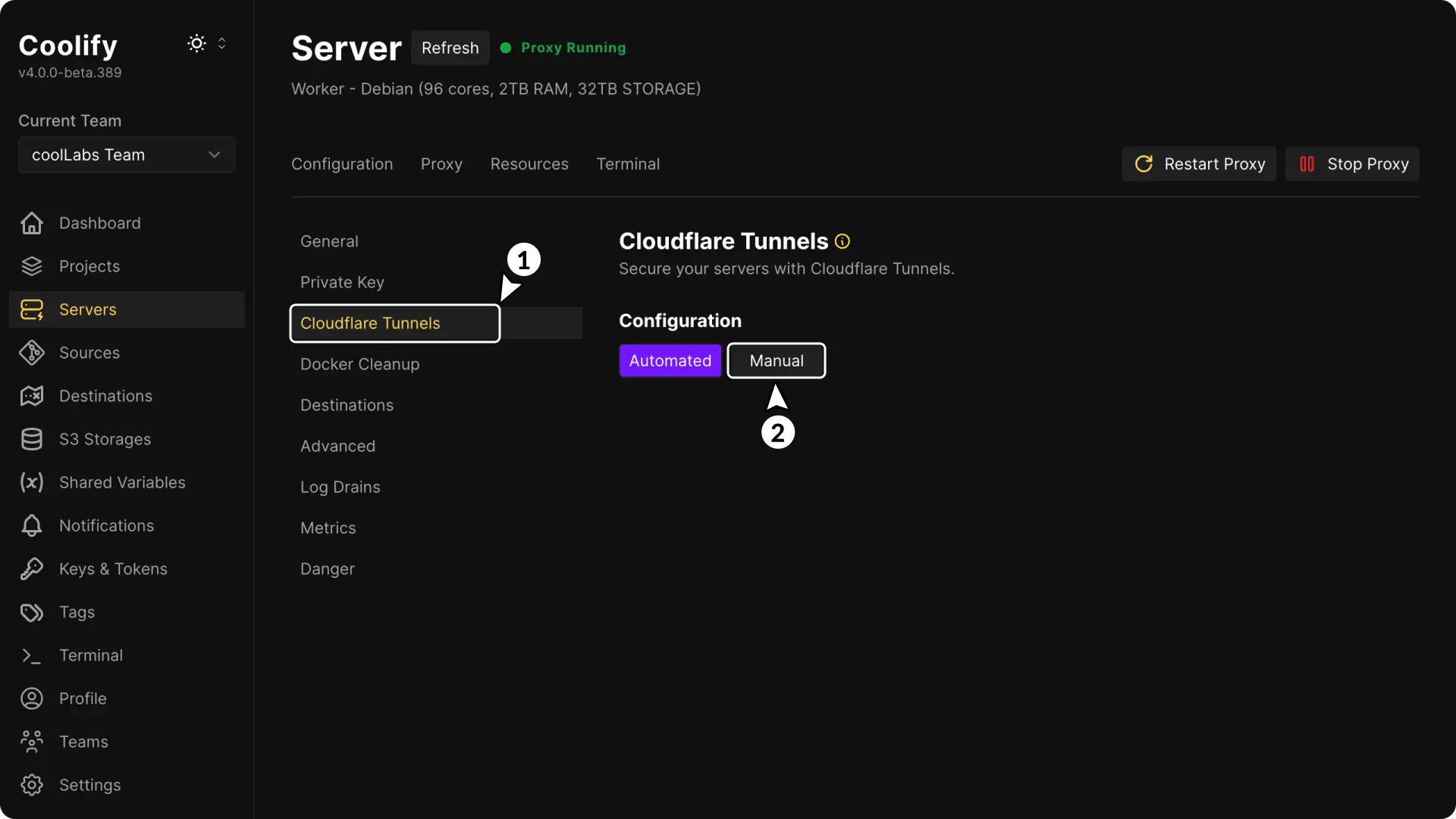 To use Coolify's automated setup for a Cloudflare Tunnel: