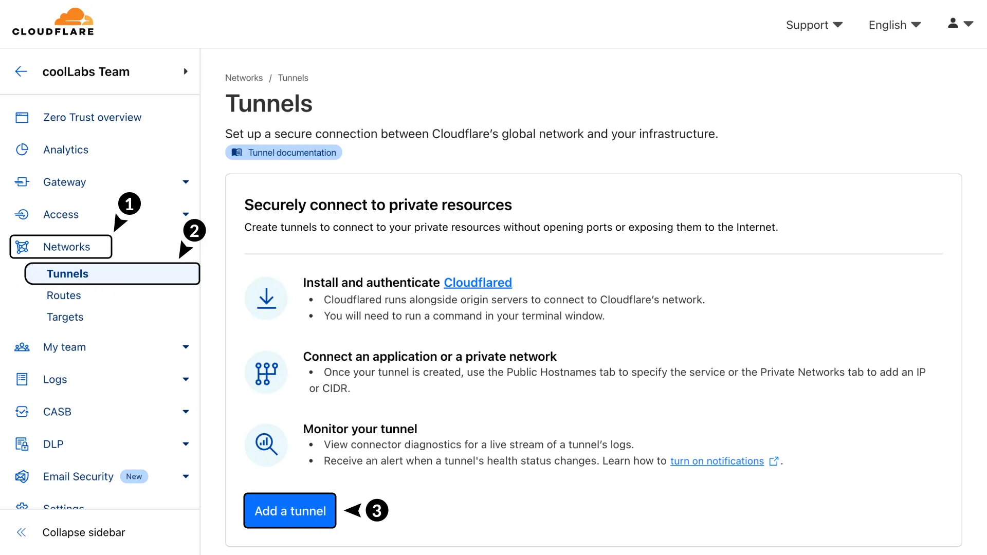 To create a Cloudflare Tunnel, first log in to your Cloudflare account and go to the Zero Trust page.