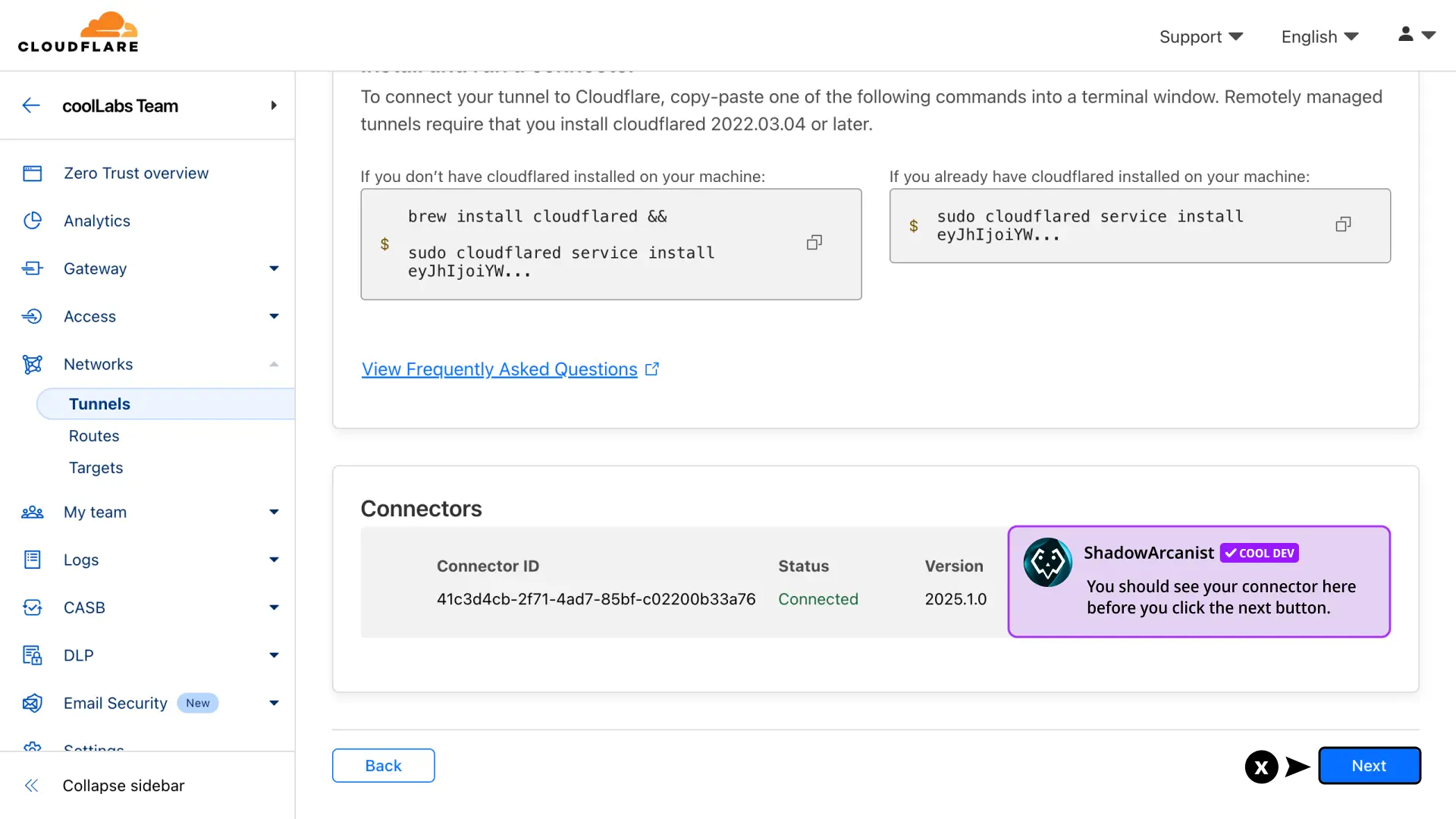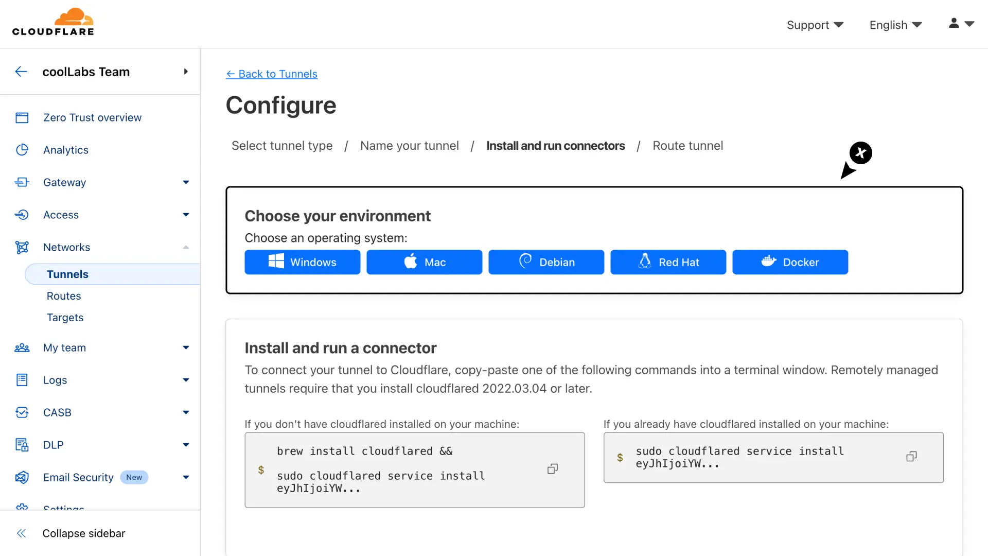 Copy the install command, which contains the token for your tunnel (token starts with "eyJ"). Make sure to save only the token, removing the command part before it, and store it in a safe place, as we need it later.