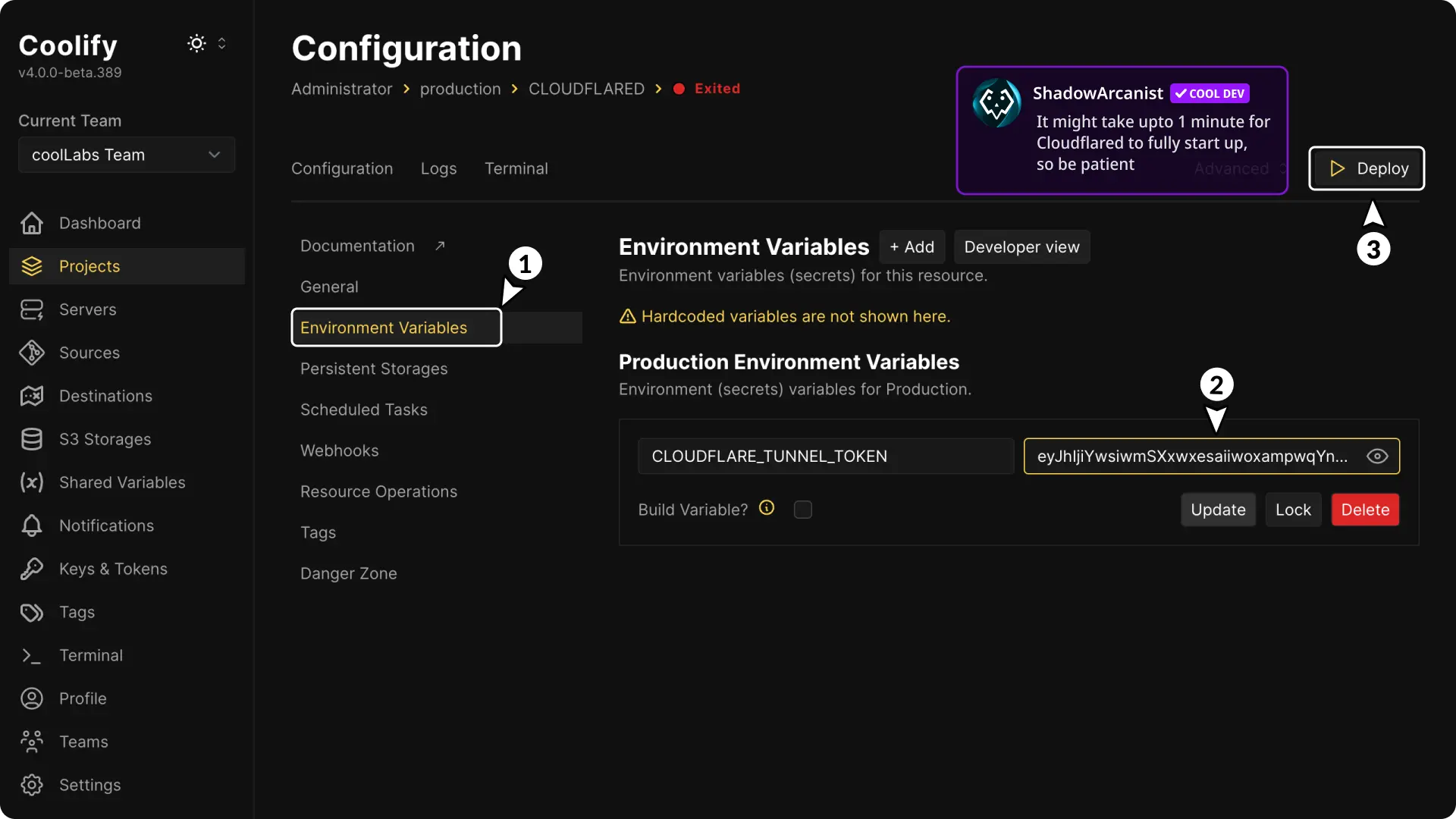Go to the Environment Variables page, enter your tunnel token, and deploy the Cloudflared app. This token was copied in Step 2