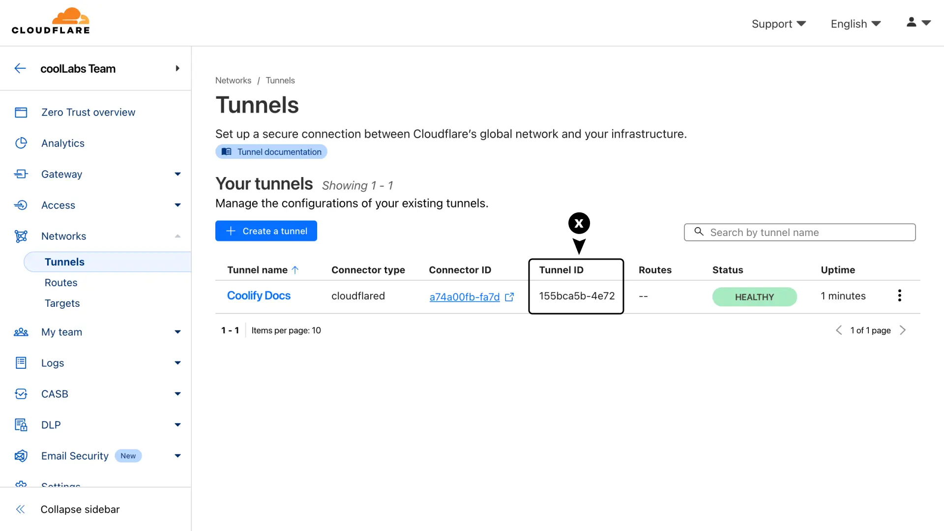 First, copy your tunnel ID from the Tunnels page on the Cloudflare dashboard.