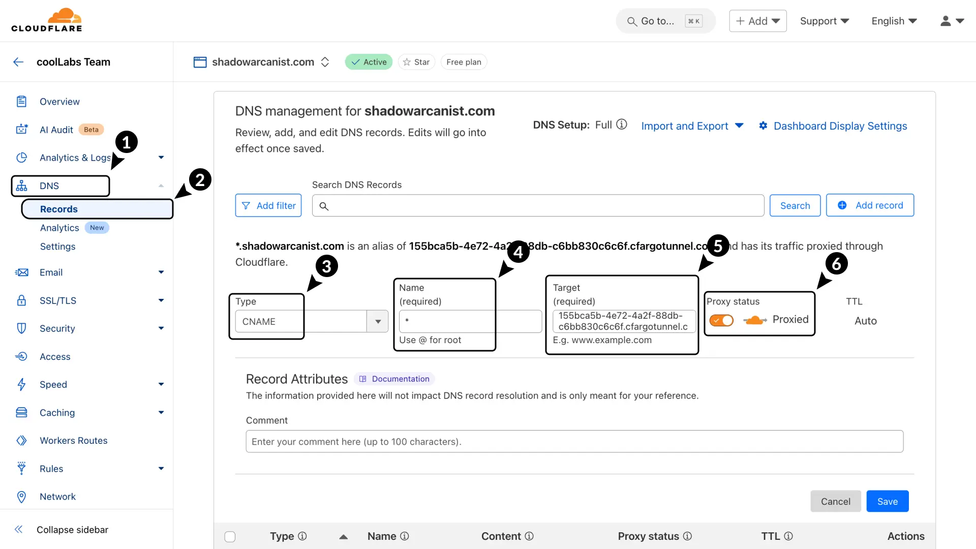 *or the name of your subdomain (this should match the hostname you have for your app on the tunnel). - For the Target, enter the tunnel ID followed by