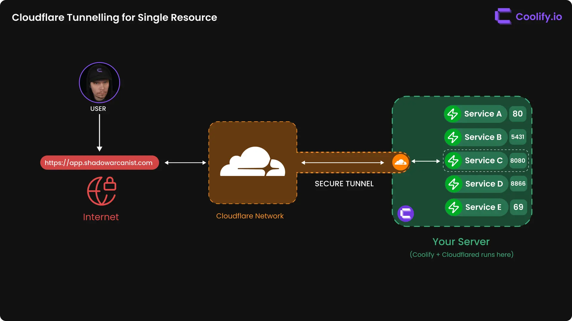 Tunneling multiple single resources is straightforward, but tunneling Coolify itself requires additional manual setup.