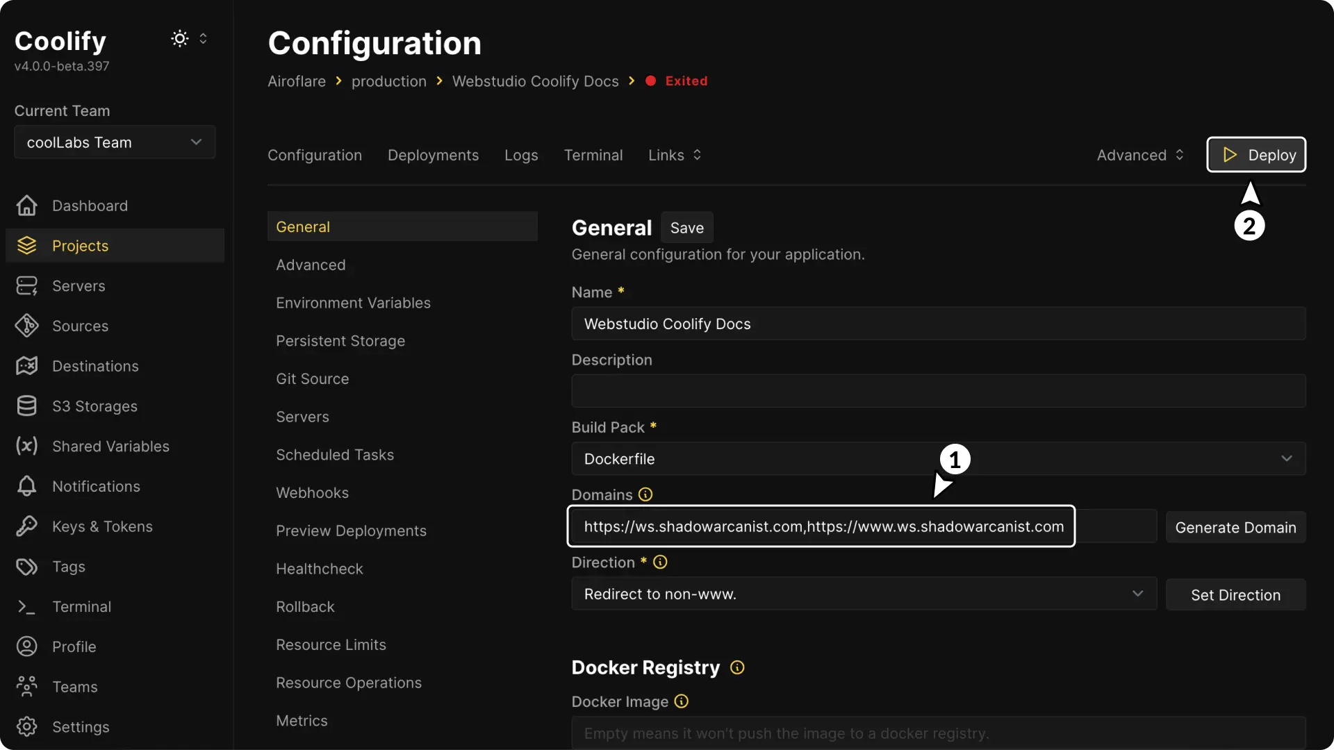 - Configure Domains & Deploy: Enter your domain in the domains field and Click Deploy and wait as Coolify builds and deploys your project.