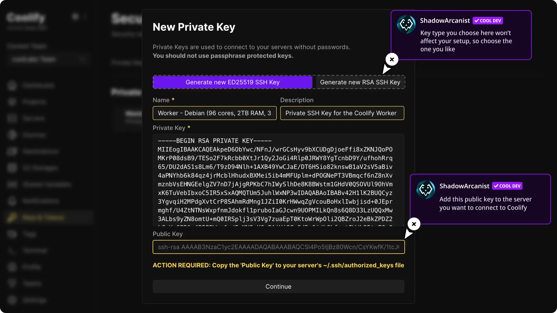 - Add Private Key: Login to your Coolify account (or create one if you’re new) and Add a new private key
